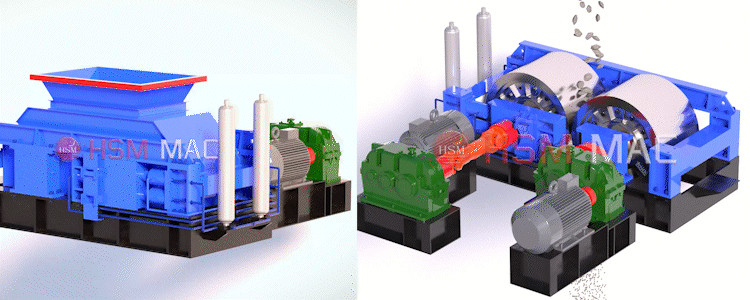 對(duì)輥破碎機(jī)是利用兩組單獨(dú)傳動(dòng)的輥軸,相對(duì)旋轉(zhuǎn)產(chǎn)生的擠軋和磨剪力來(lái)破碎物料。物料經(jīng)給料口落入兩輥之間,經(jīng)對(duì)輥擠壓破碎之后成品自然落下,當(dāng)遇到過(guò)硬或者不可破碎的物料時(shí),輥?zhàn)涌蓱{液壓缸或彈簧的作用自動(dòng)退讓,使雙輥之間的間隙增大,過(guò)硬或不可破碎的物料自然落下,以此來(lái)保證機(jī)器不被損壞,相向轉(zhuǎn)動(dòng)的兩個(gè)輥?zhàn)涌梢哉{(diào)節(jié)液壓缸或彈簧的壓力來(lái)控制產(chǎn)品的出料粒度。